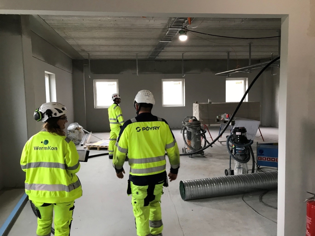 Mattias Klingestad, Area Manager från Pöyry, leder säkerhetsronden som Helen går med på. Säkerhetsronderna börjar kl. 13.00 och hela säkerhetsteamet på omkring 20 personer träffas på ”Lilla torget”, en öppen yta på grusplanen utanför KM7-byggnaden. Där delar de upp sig i team och talar om för varandra vilka delar av KM7-bygganden de ska kontrollera under rundan. Mattias Klingestad leder rundan och i rask takt går vi in i KM7-byggnaden och in i de första elrummen. På vissa ställen ser det bra ut, på andra behöver det städas.